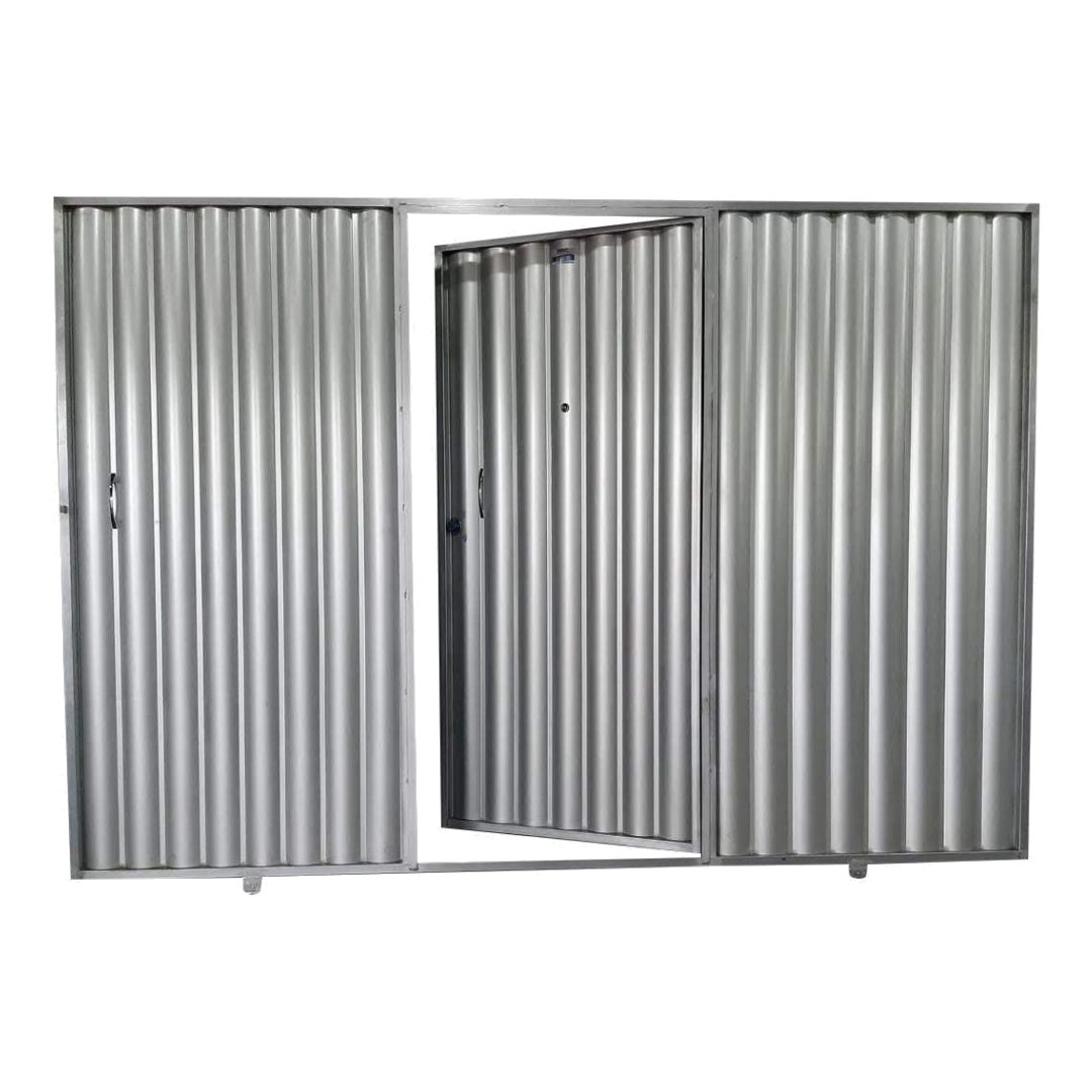 O metalon é galvanizado e mede 30mm X 30mm, na espessura parede 18. Chapa lambril ondulado, espessura 22 e galvanizada. Apenas o batente é barra de aço comum.