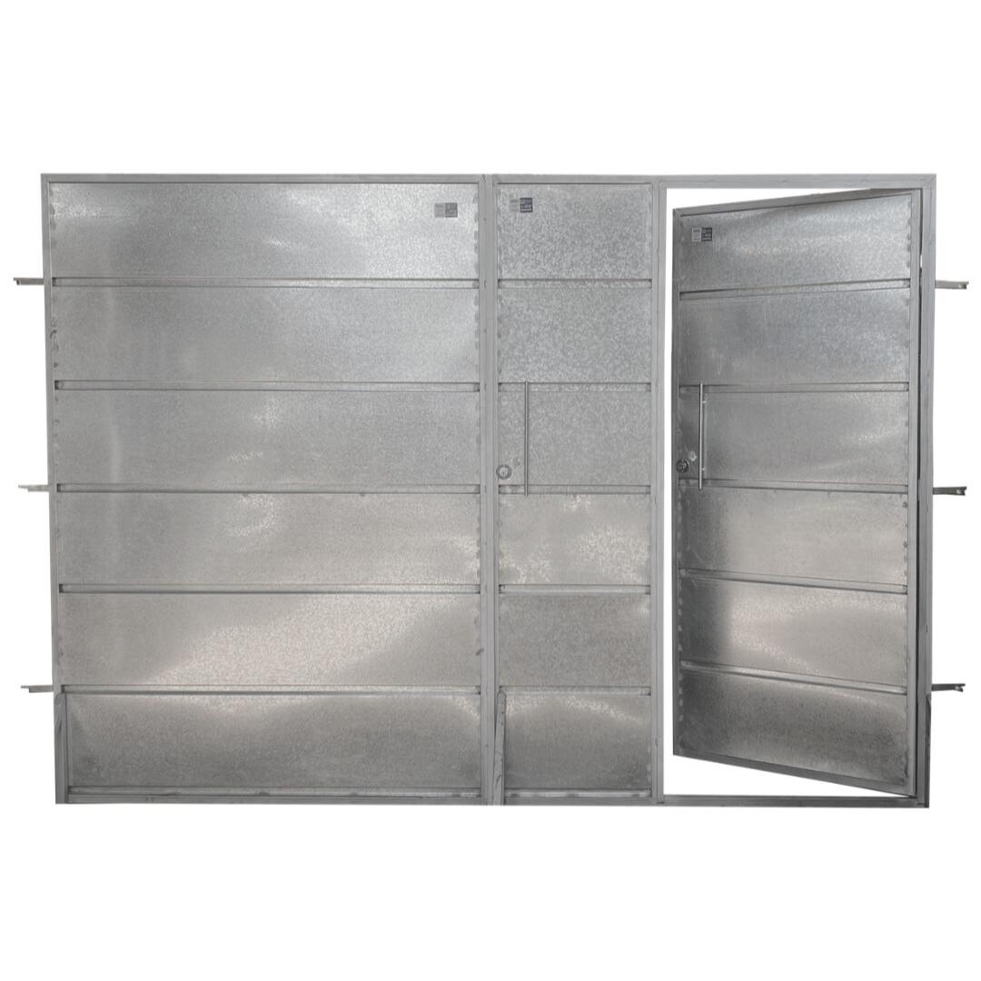 O Portão Duas Folhas Com Social Acoplado possui duas folhas iguais com um social acoplado na lateral conforme a imagem. Este portão de garagem oferece a praticidade de poder abrir apenas o social para entrada de pessoas ou abrir as duas bandas para passar com o carro.